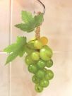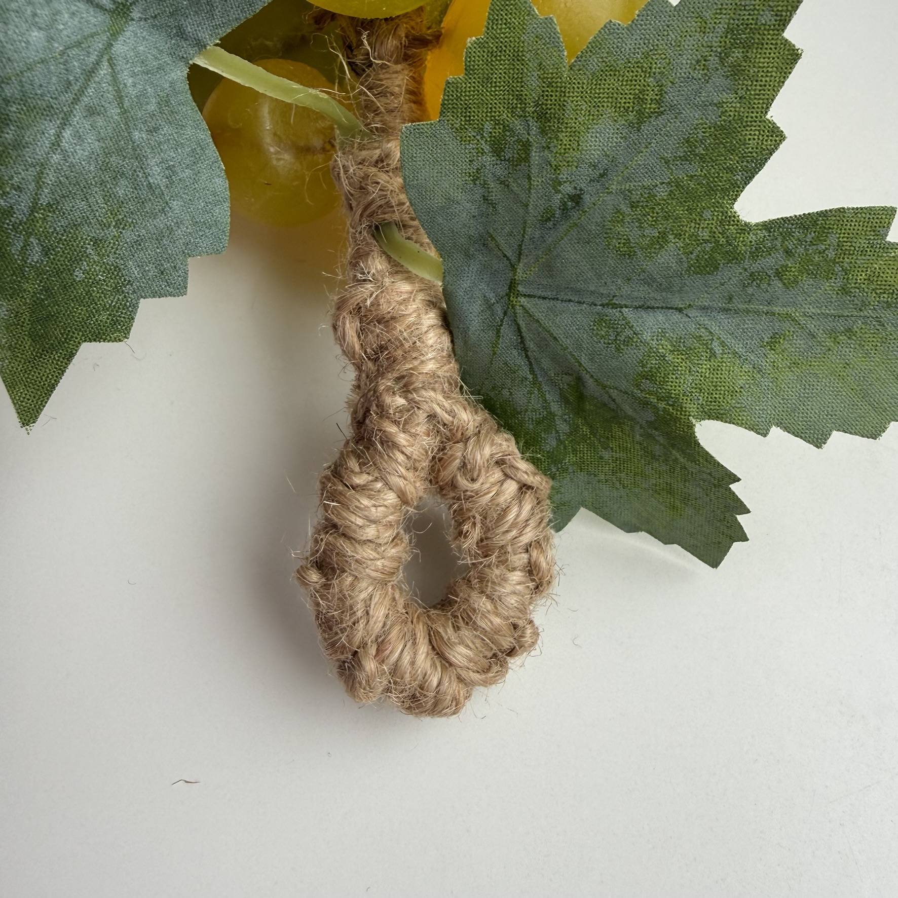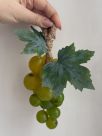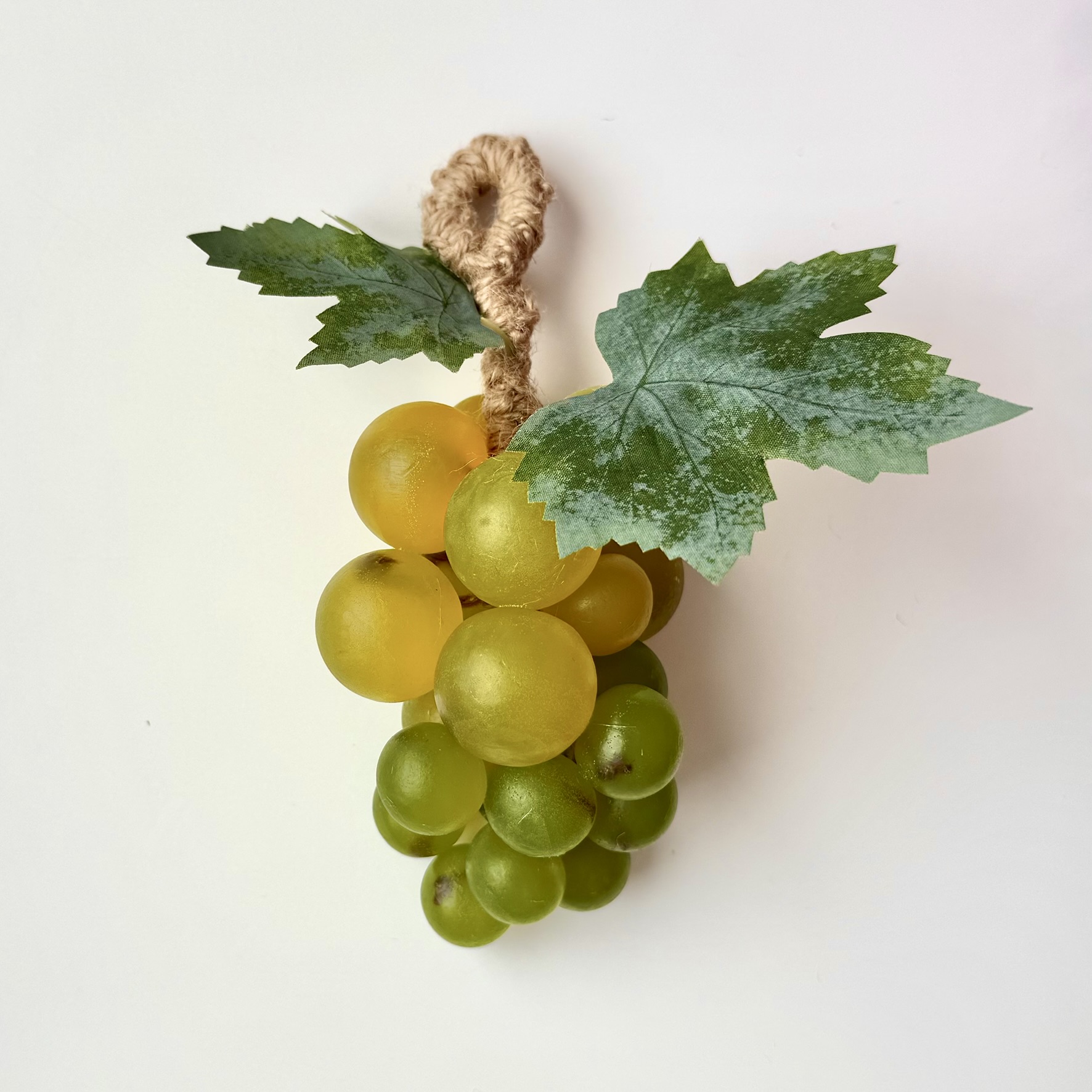 Сочные ягоды переливаются оттенками спелого винограда: от золотисто-медового до прохладного зелёного. Каждая ягодка отлита и собрана вручную, поэтому гроздь выглядит живой, объёмной и натуральной. Фактурные листья с лёгким «налётом» естественности и скрученные в лозу джутовые нити завершают композицию, создавая ощущение настоящего ботанического шедевра.